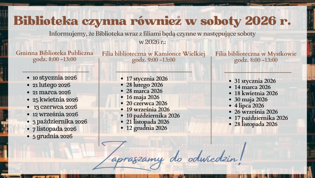 Miło nam poinformować, że w 2026 roku nasza biblioteka wraz z filiami bibliotecznymi będzie czynna również w wybrane soboty.