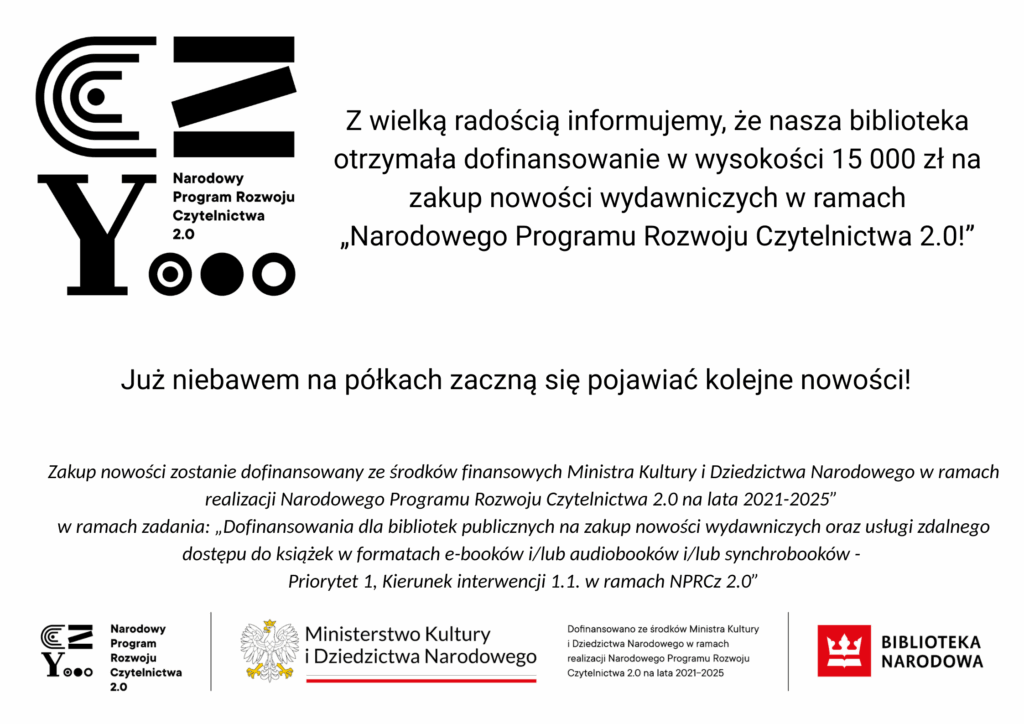 Zakup nowości zostanie dofinansowany ze środków finansowych Ministra Kultury i Dziedzictwa Narodowego w ramach realizacji Narodowego Programu Rozwoju Czytelnictwa 2.0 na lata 2021-2025”w ramach zadania: „Dofinansowania dla bibliotek publicznych na zakup nowości wydawniczych oraz usługi zdalnego dostępu do książek w formatach e-booków i/lub audiobooków i/lub synchrobooków – Priorytet 1, Kierunek interwencji 1.1. w ramach NPRCz 2.0”