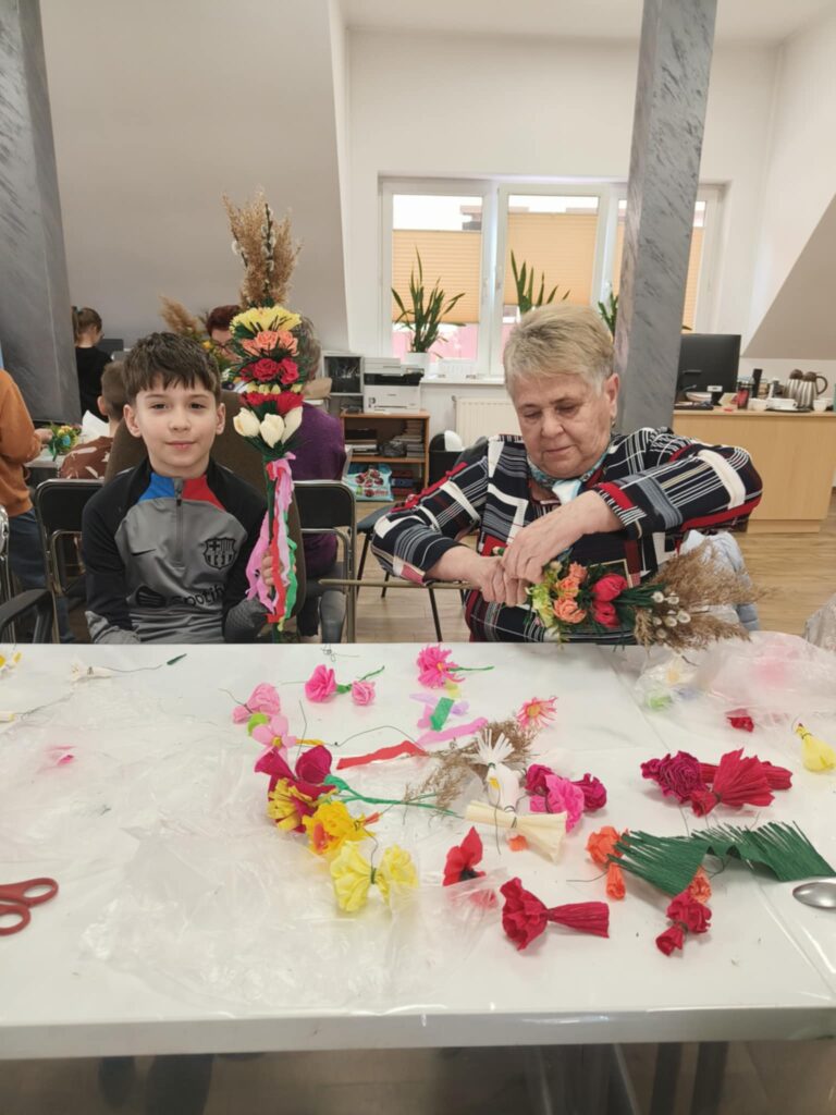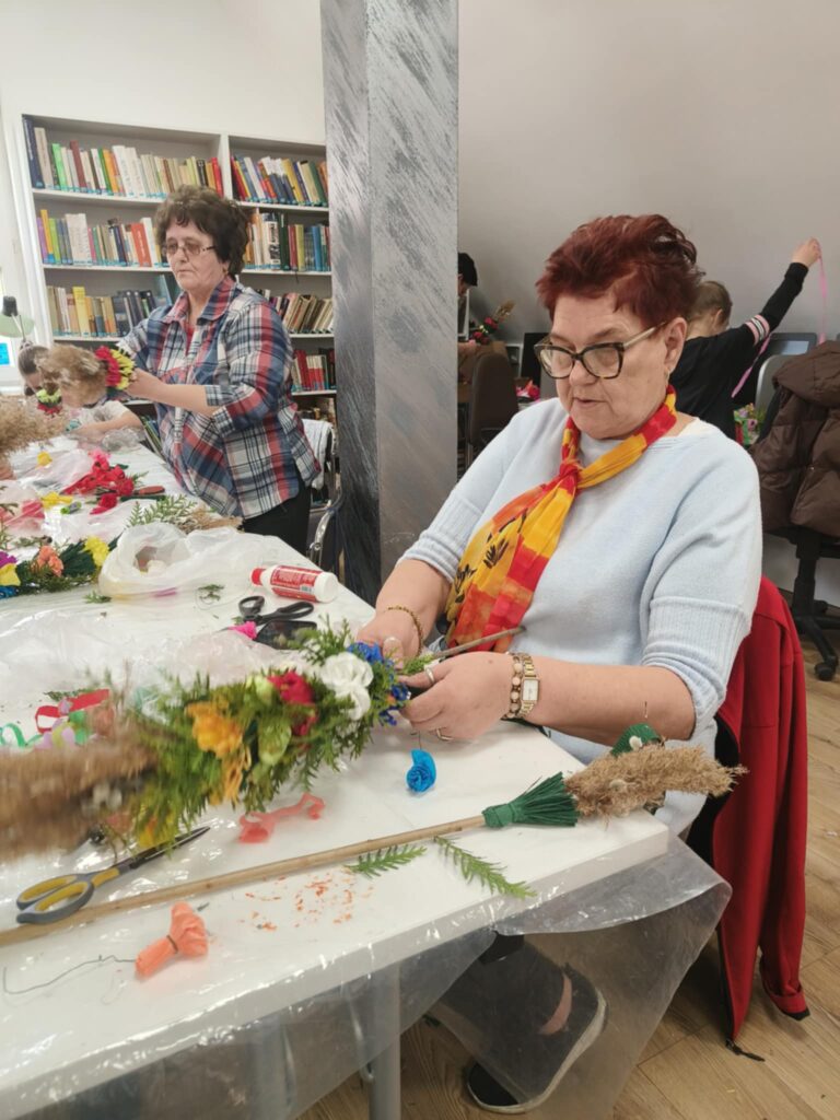 Podczas warsztatów uczestnicy z zaangażowaniem tworzyli barwne palmy, wykorzystując tradycyjne materiały i techniki. Seniorzy chętnie dzielili się swoją wiedzą i umiejętnościami z młodszymi uczestnikami, co sprzyjało budowaniu więzi oraz wzajemnemu poznawaniu się.